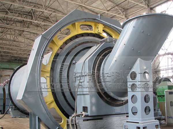 原煤由喂料設(shè)備進入到磨機的進料裝置中,溫度為300℃左右的熱風也通過進風管進入進料裝置,含有水分的原煤在此處就開始進行熱交換;當原煤進入磨機的烘干倉時,由于烘干倉內(nèi)設(shè)有特制的揚料板將原煤揚起,使得原煤在此處進行強烈的熱交換而得到烘干,烘干后的煤塊通過設(shè)有揚料板的雙層隔倉板進入粉磨倉。粉磨倉內(nèi)裝有研磨體(鋼球),煤塊在此倉內(nèi)被粉碎、研磨成煤粉。在煤塊被粉碎的同時,由專用的引風機經(jīng)過磨機的出料裝置將已粉碎的煤粉及氣體一同帶出磨機,較粗的顆粒會經(jīng)過出料裝置的返料螺旋返回到粉磨倉內(nèi)進行再次粉磨。